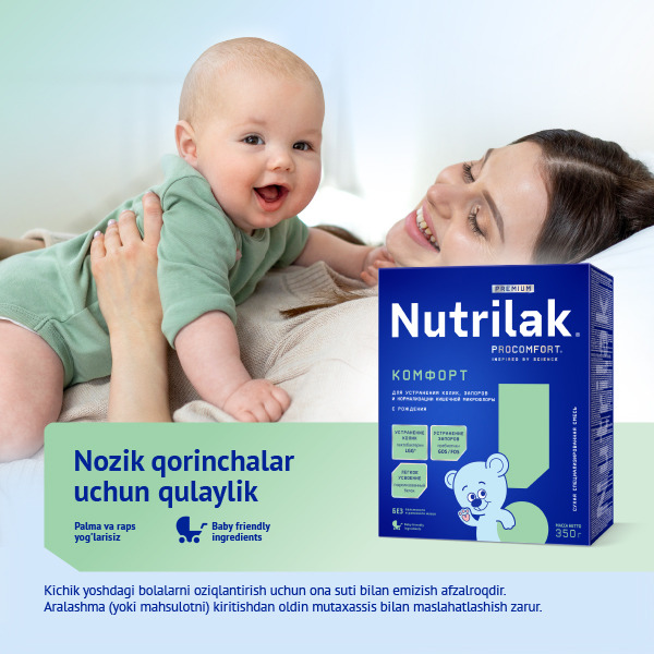 Ushbu 5 komponentning barchasini “Комфорт” aralashmalarida topish mumkin, ammo “Комфорт” yorlig’i ular avtomatik ravishda bu aralashma tarkibida mavjud degani emas. Kichkintoyga ovqat hazm qilish uchun chindan ham qulay aralashmani berish uchun qadoqdagi tarkibni diqqat bilan o’qing va sanab o’tilgan barcha shartlar bajarilganligiga ishonch hosil qiling. Nutrilak Premium Комфорт aralashmasiga e’tibor qaratishni maslahat beramiz.