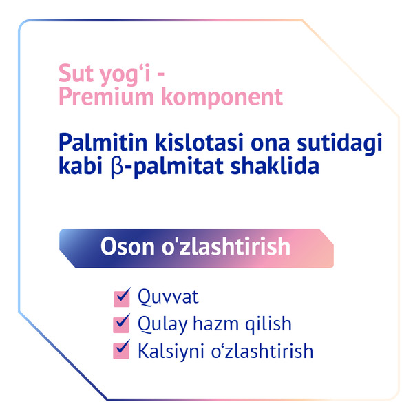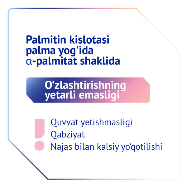 - Tarkibida o‘zlashtiriladigan shaklda (β-palmitat) palmitin kislotasi mavjud bo‘lib, u zarur energiya olishga, kalsiyni yaxshiroq o‘zlashtirishga va qabziyatning oldini olishga yordam beradi.M. Giovannini,1995