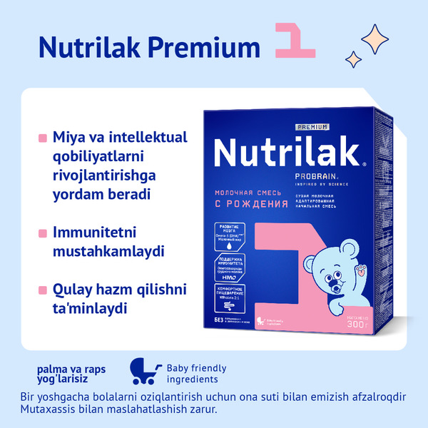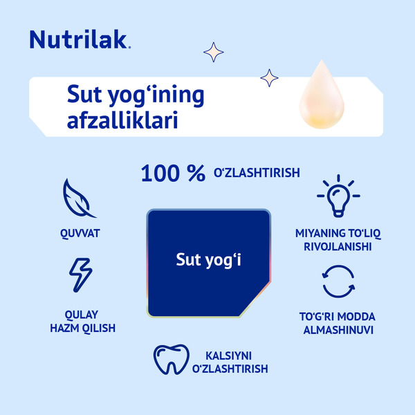 - Sut yog‘i Nutrilak aralashmasining yog‘ tarkibini ona sutiga yaqinlashtiradi