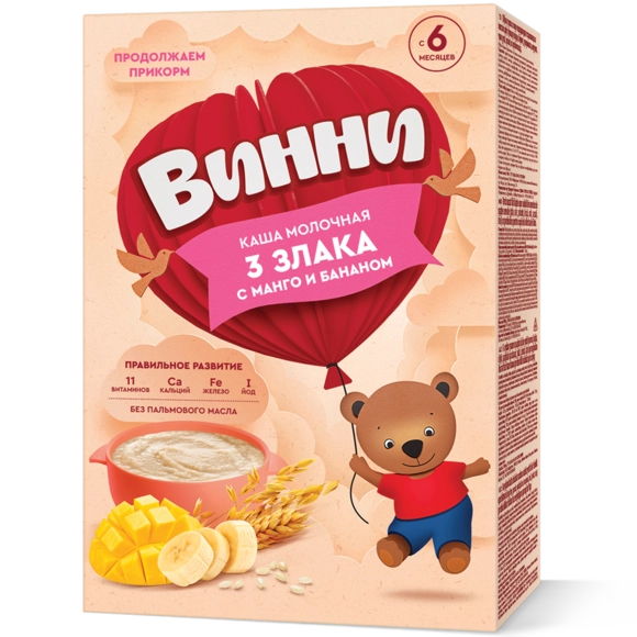 Ko’p donli yormalar 6 oydan oshgan chaqaloqning ratsionini kengaytirish uchun to’g’ri keladi. Mango va banan qo'shilgan sutli 3 donli bo'tqa - chaqalog'ingizni yangi lazzatlar bilan tanishtirish uchun yaxshi imkoniyatdir.