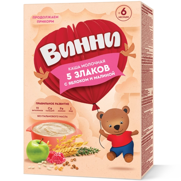 Ko’p donli yormalar 6 oydan oshgan chaqaloqning ratsionini kengaytirish uchun to’g’ri keladi. Olma va malinali 5 donli sutli bo'tqa chaqaloq uchun yangi lazzat kombinatsiyalari bilan tanishish uchun yaxshi imkoniyatdir: don va mevalar bir likobchada.