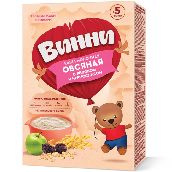 Suli uni, butun quruq sut, shakar, olma bo'laklari, qora olxo’ri bo'laklari, mineral moddalar (kaltsiy karbonat, temir pirofosfat, kaliy yodid), vitaminlar (L-askorbin kislotasi, nikotinamid, D-alfa- asetat, kaltsiy D-pantotenat, riboflavin, piridoksin gidroxloridi, tiamin mononitrat, retinol asetat, foliy kislotasi, D-biotin, sianokobalamin).