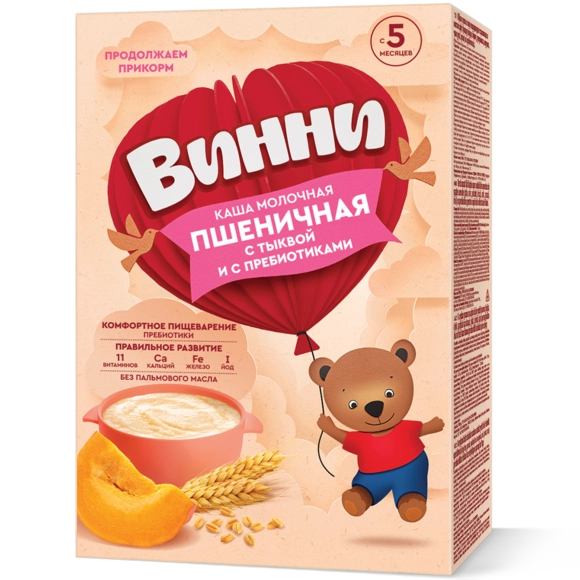 Bug'doy yormalari kaliy, temir va fosforga boy, kletchatkaning katta foizini o'z ichiga oladi. Qovoq va prebiotikli sutli bug'doy bo’tqasi 5 oylikdan katta chaqaloqning ta'm palitrasini kengaytirishga yordam beradi.