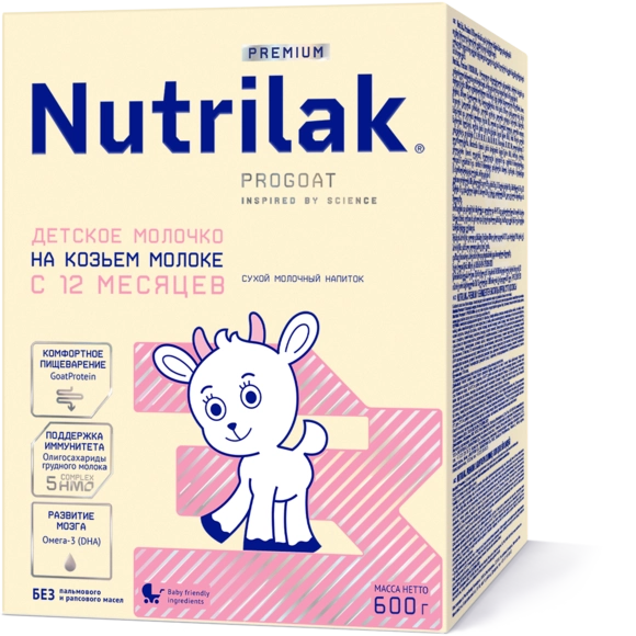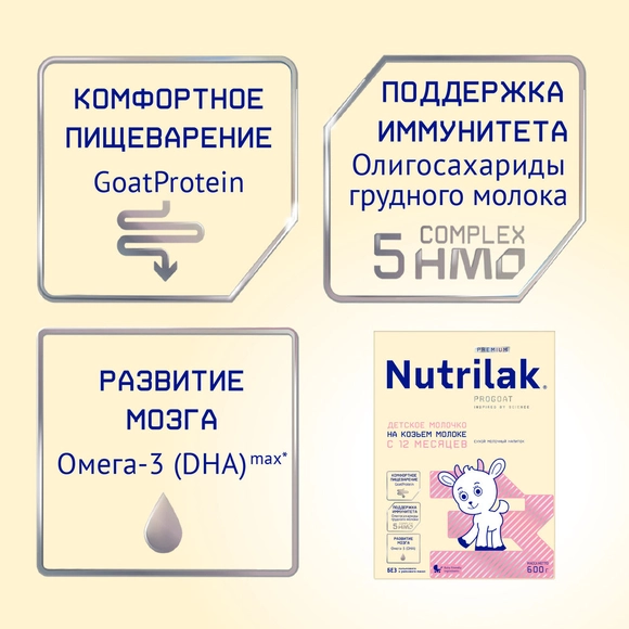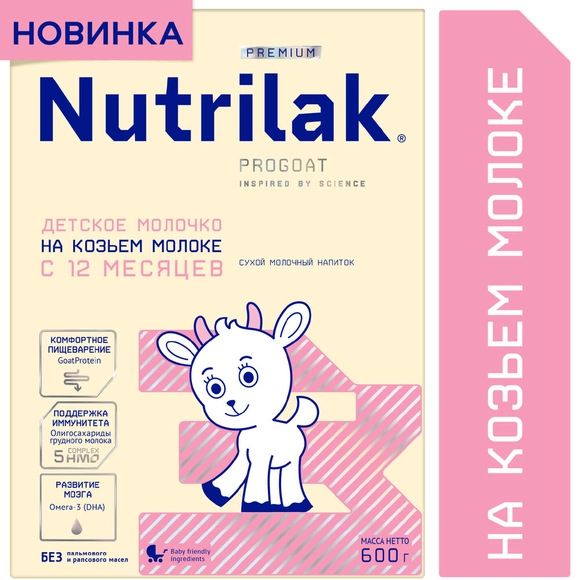 Tarkibi: qaymog’i olinmagan echki suti kukuni, maltodekstrin, maltodekstrin, laktoza (sut shakari), o’simlik yog’lari (soya, yuqori oleinli kungaboqar, kokos), mineral moddalar (kalsiy fosfati (ortofosfor kislotasining kalsiy tuzlari), kalsiy karbonati, natriy sitrati, magniy sitrati, temir (II) sulfati, rux sulfati, mis sulfati, marganets xloridi, kaliy yodidi, natriy seleniti), vitamin kompleksi (L-askorbin kislotasi, DL-alfa-tokoferol atsetati, nikotinamid, D-kalsiy pantotenati, riboflavin, retinol atsetati, piridoksin gidroxloridi, tiamin gidroxloridi, foliy kislotasi, filloxinon, D-biotin, D3 xolekalsiferol, siankobalamin), oligosaxaridlar kompleksi 5-HMO (2'-fukozillaktoza (2'-FL), lakto-N-tetraoz( LNT), 6'-sialillaktoza (6'-SL), difukosillaktoza (DFL), 3'-sialillaktoza (3'-SL), xolin bitartrat, ko’p to'yinmagan omega-3 yog’ kislotalari (DHA dokozageksayenli kislota manbai), taurin, Inozitol, emulgator (soya lesitini), antioksidant (L-askorbilpalmitat).