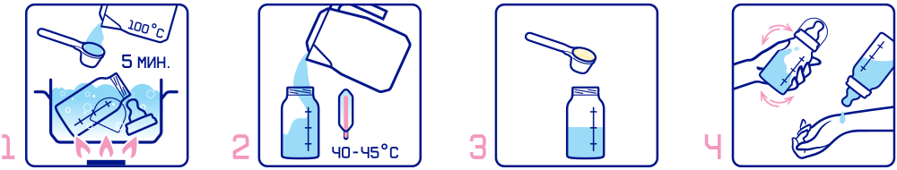 - Вымойте руки и простерилизуйте бутылочку, соску и крышку. Обязательно используйте прилагаемую мерную ложку. Перед использованием обработайте ее кипящей водой и высушите.