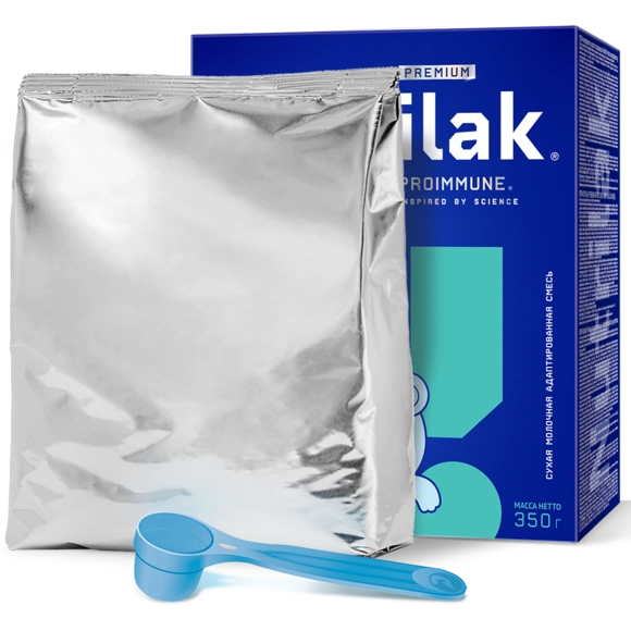 Quruq demineralizatsiyalangan sut zardobi, o‘simlik yog`lari (kungaboqar yuqori oleinli, soya, kakos yog`lari), quruq sut, maltodekstrin, sut yog`i, yog‘sizlantirilgan quruq sut, mineral moddalar (kalsiy karbonat, kaliy sitrat, kalsiy fosfat, natriy xlorid, magniy xlorid, kaliy xlorid, temir (II) sulfat, rux sulfat, mis sulfat, marganets xlorid, kaliy yodid, natriy selenit), galaktooligosaxaridlar, sut zardobi oqsili konsentrati, baliq yog'i (dokozageksayen kislotasi DHA manbai), Mortierella Alpina yog’i (araxidon kislotasi ARA manbai), vitamin kompleksi (L-askorbin kislotasi, DL-alfa-tokoferol asetat, nikotinamid, kalsiy D-pantotenat, riboflavin, retinol asetat, piridoksin gidroxloridi, tiamin gidroxloridi, foliy kislotasi, filloxinon, D-biotin, D3 xolekalsiferol, sianokobalamin), B. Lactis (BB-12™) bifidobacteriyalari kontsentrati, L. rhamnosus (LGG®) laktobakteriyalari kontsentrati, emulgator (soya lesitini), taurin, inozit, nukleotidlar (sitidin 5'-monofosfor kislotasi, uridin 5'-monofosfat dinatriyli tuzi, adenozin 5'-monofosfor kislotasi, guanozin 5'- monofosfat dinatriyli tuzi, inozin 5'- monofosfat dinatriyli tuzi), L-karnitin, xolin bitartrat, antioksidlovchi (askorbilpalmitat), lyutein. Tarkibida GMO mavjud emas!