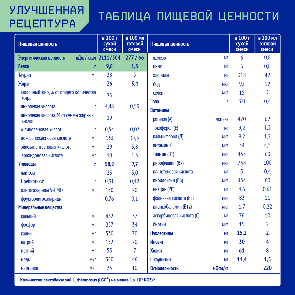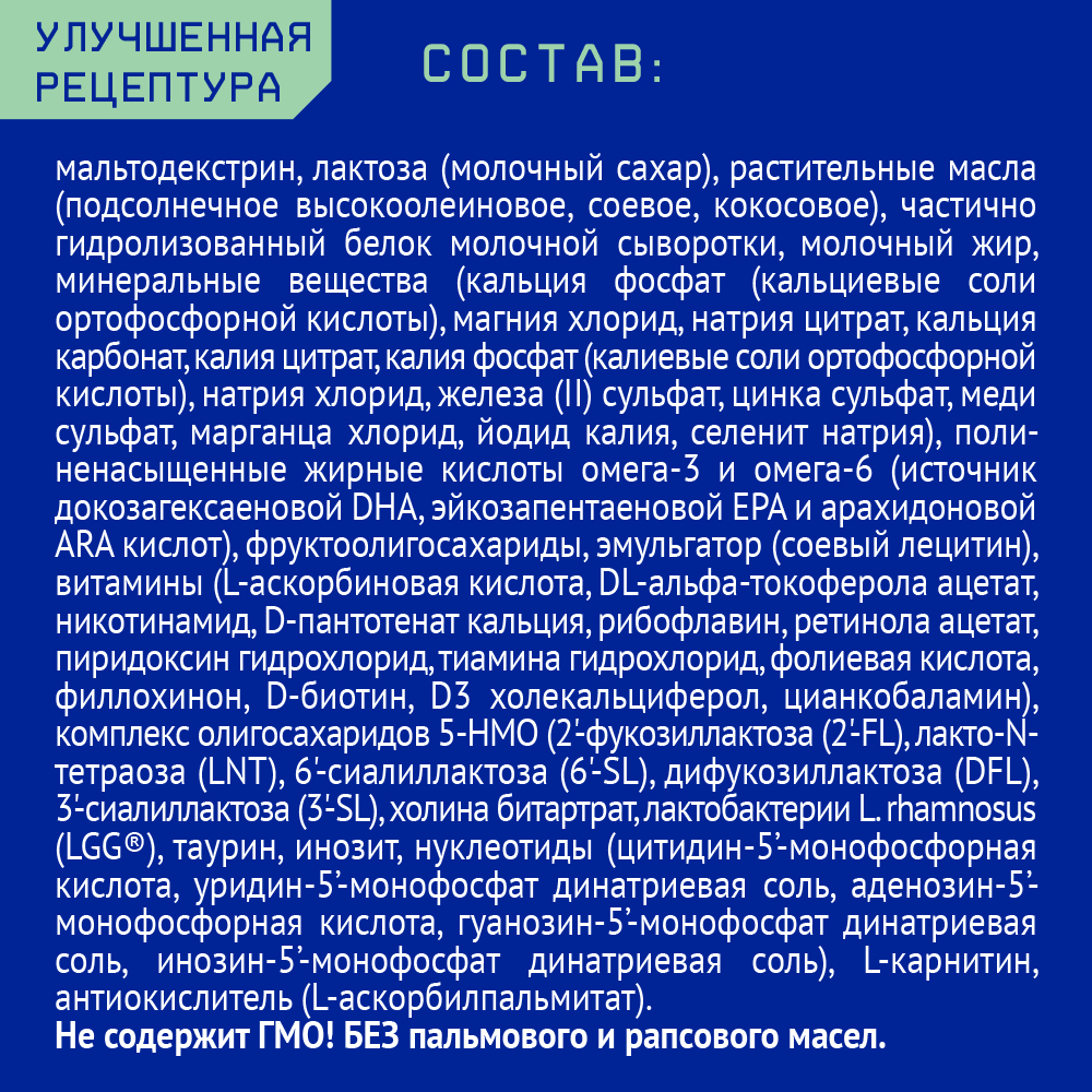 Адаптированный жирнокислотный состав приближен к грудному молоку, легко усваивается, способствует комфортному пищеварению и регулярному мягкому стулу.