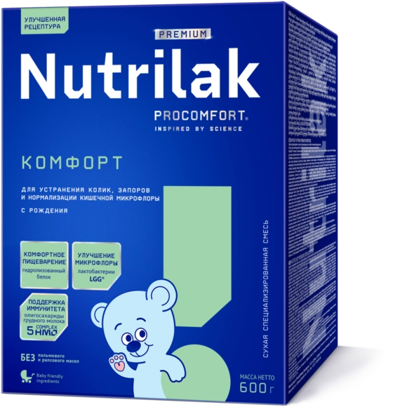 Мальтодекстрин, лактоза (молочный сахар), растительные масла (подсолнечное высокоолеиновое, соевое, кокосовое), частично гидролизованный белок молочной сыворотки, молочный жир, минеральные вещества (кальция фосфат (кальциевые соли ортофосфорной кислоты), магния хлорид, натрия цитрат, кальция карбонат, калия цитрат, калия фосфат (калиевые соли ортофосфорной кислоты), натрия хлорид, железа (II) сульфат, цинка сульфат, меди сульфат, марганца хлорид, йодид калия, селенит натрия), полиненасыщенные жирные кислоты омега-3 и омега-6 (источник докозагексаеновой DHA, эйкозапентаеновой EPA и арахидоновой ARA кислот), фруктоолигосахариды, эмульгатор (соевый лецитин), витамины (L-аскорбиновая кислота, DL-альфа-токоферола ацетат, никотинамид, D-пантотенат кальция, рибофлавин, ретинола ацетат, пиридоксин гидрохлорид, тиамина гидрохлорид, фолиевая кислота, филлохинон, D-биотин, D3 холекальциферол, цианкобаламин), комплекс олигосахаридов 5-HMO (2'-фукозиллактоза (2'-FL), лакто-N-тетраоза (LNT), 6'-сиалиллактоза (6'-SL), дифукозиллактоза (DFL), 3'-сиалиллактоза (3'-SL), холина битартрат, лактобактерии L. rhamnosus (LGG®), таурин, инозит, нуклеотиды (цитидин-5’-монофосфорная кислота, уридин-5’-монофосфат динатриевая соль, аденозин-5’-монофосфорная кислота, гуанозин-5’-монофосфат динатриевая соль, инозин-5’-монофосфат динатриевая соль), L-карнитин, антиокислитель (L-аскорбилпальмитат).