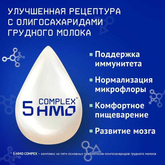 5-HMO* complex – комплекс из 5 основных олигосахаридов, структурно идентичных1 наиболее распространенным видам олигосахаридов, которые присутствуют в грудном молоке для поддержки иммунной системы и защиты от инфекций.
