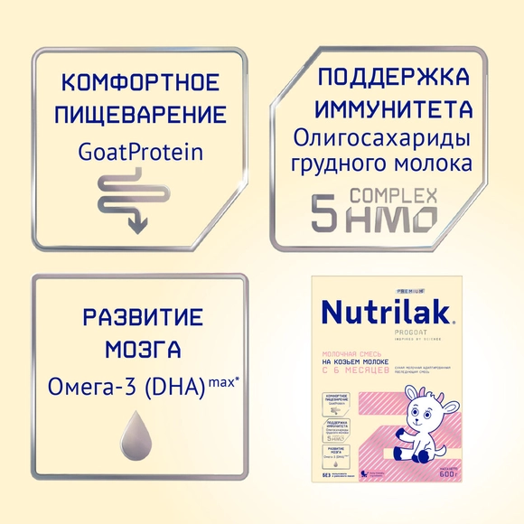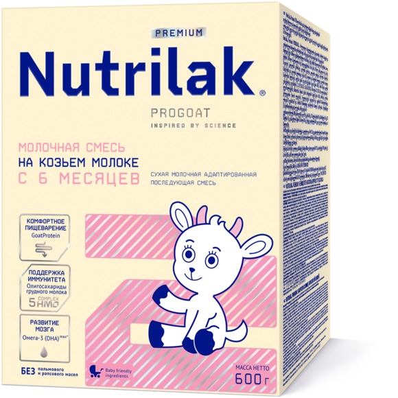 Tarkibi: qaymog’i olinmagan echki suti kukuni, laktoza (sut shakari), o’simlik yog’lari (yuqori oleinli kungaboqar, soya, kokos), maltodekstrin, omega-3 ko’p to’yingan yog’ kislotalari (DHA dokozageksayenli kislota manbai ), 5-HMO oligosaxarid kompleksi, (2'- fukozillaktoza (2'-FL), lakto-N-tetraoza (LNT), 6'- sialillaktoza (6'-SL), difukozillaktoza (DFL), 3'- sialillaktoza (3'-SL), mineral moddalar (kalsiy karbonat, natriy sitrat, temir (II) sulfat, rux sulfat, mis sulfat, marganets xlorid, kaliy yodidi, natriy seleniti), vitamin kompleksi (L-askorbin kislotasi, DL-alfa-tokoferol atsetati, nikotinamid, kalsiy D-pantotenati, riboflavin, retinol atsetati, piridoksin gidroxloridi, tiamin gidroxloridi, foliy kislotasi, filloxinon, D-biotin, D3 xolekalsiferol, siankobalamin), xolin bitartrat, L-sistin, L-triptofan, Inozit, taurin, emulgator (soya lesitini), ko’p to’yinmagan omega-6 yog’ kislotalari (ARA araxidon kislotasi manbai), nukleotidlar (sitidin-5'- monofosfor kislotasi, uridin-5'- monofosfat dinatriy tuzi, adenozin-5'- monofosfor kislotasi, guanozin-5'- monofosfat dinatriy tuzi, inozin-5' - monofosfat dinatriy tuzi), L-karnitin, antioksidant (L-askorbilpalmitat).